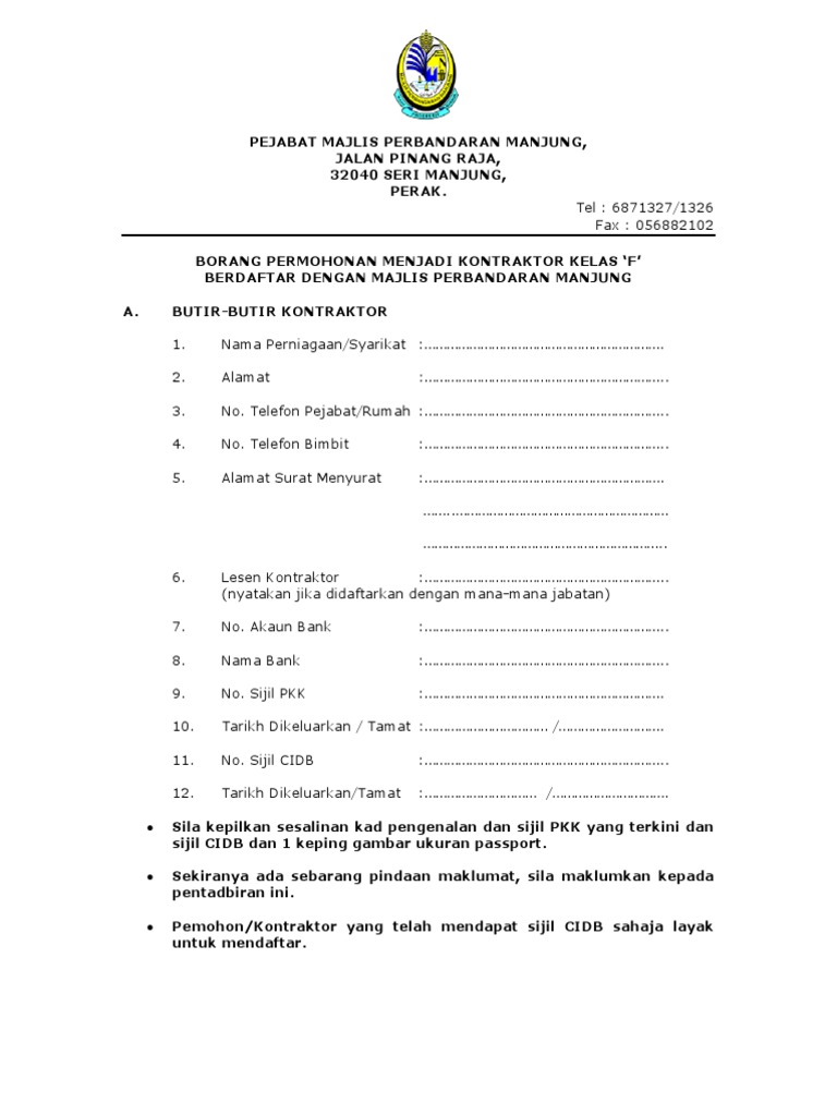Presiden persatuan kontraktor bumiputera kelas 'f' malaysia (perkobf) tukiman radion berkata sejak 2008, lebih 10 ribu kontraktor kelas berkenaan yang terpaksa gulung tikar akibat sukar mendapat projek. Lesen kontraktor g1, alor setar. Mengalami kesukaran untuk berurusan dengan cidb? Kami menawarkan perkhidmatan pendaftaran perniagaan dan syarikat (ssm), lesen kontraktor pembekal kementerian kewangan(mof). Bersetuju pendaftaran lesen kontraktor …