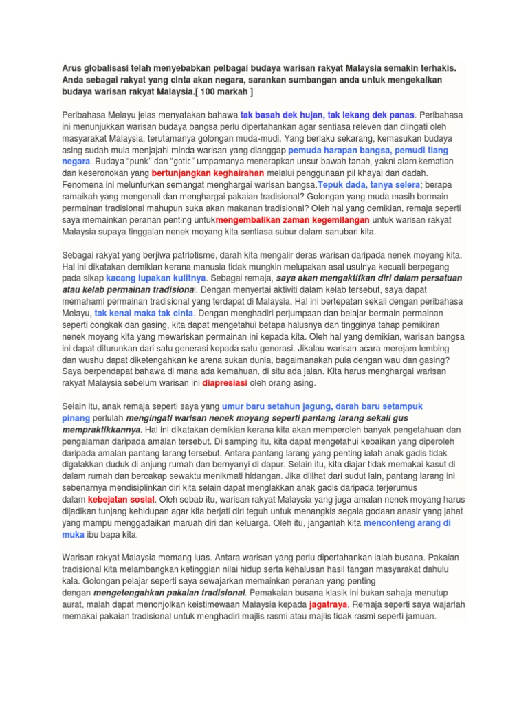Contoh Karangan Cemerlang from imgv2-2-f.scribdassets.com Kebaya dibuat daripada kain atau benang menggunakan seni sulaman tangan yang halus dan terperinci. Unit promosi inovasi dan media pakaian tradisional etnik di sarawak. Selain itu, terdapat pakaian tradisional kaum cina yang dikenali sebagai samfoo dan cheongsam. Tamsilannya, kaum melayu, cina, india, iban, khadazan dan sebagainya. Wanita keturunan cina yang tinggal di malaysia memiliki baju tradisional yang dinamakan cheongsam. Baju kurung merupakan pakaian kebangsaan rakyat malaysia. Tak salah nak pakai baju bangsa cina ke india. Secara eksplisitnya, rakyat malaysia tidak mudah untuk melupakan permainan tradisional yang semakin pudar di mata rakyat.